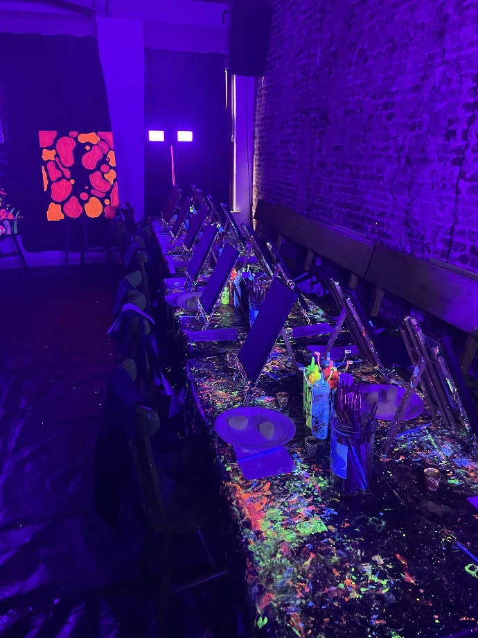 Sous lumière noire, les couleurs s’illuminent et les créations prennent vie. Les enfants (et même les plus grands !) adorent cette ambiance immersive digne d’un mini studio artistique.